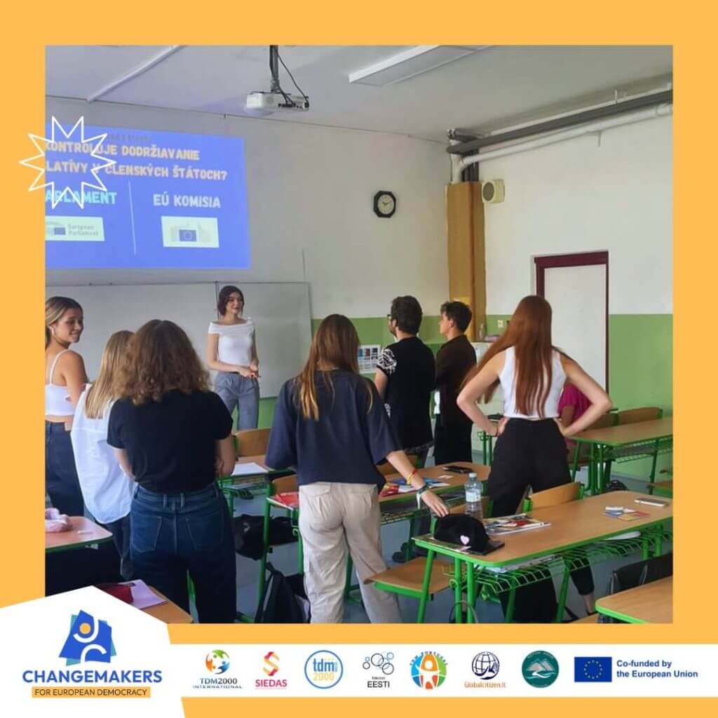 Dobrovoľníci z Changemakers projektu sa počas mesiacov september a november angažovali na gymnáziu v Nitre, kde študentom prostredníctvom interaktívnych prezentácií, zameraných na fungovanie a inštitúcie Európskej únie, ponúkli významnú perspektívu o tom, prečo má zmysel zapájať sa do procesu európskej demokracie s dôrazom na význam ich individuálnej participácie.