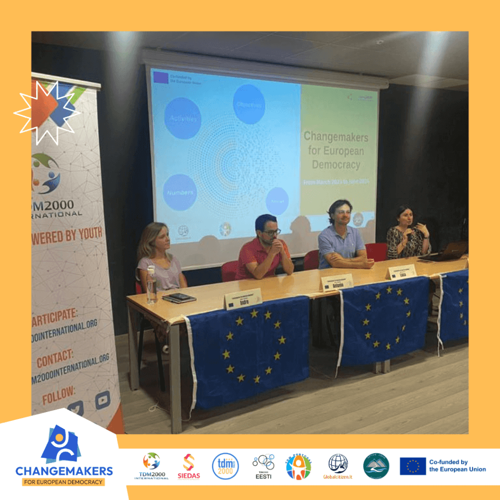V júli 2023 sa projekt „Changemakers for European Democracy“ oficiálne predstavil verejnosti počas tlačovej konferencie, ktorá sa konala na Sardínii, Taliansko, v rámci prvého stretnutia partnerov projektu. Stretnutie na Sardínii združilo partnerské organizácie zo siedmich krajín EÚ, vrátane Talianska, Slovenska, Cypru, Malty, Estónska, Litvy a Portugalska. Počas stretnutia 20. a 21. júla 2023 partneri pracovali na rozvrhnutí jednotlivých aktivít projektu, premyslení krokov ich realizácií a monitorovaní projektu.